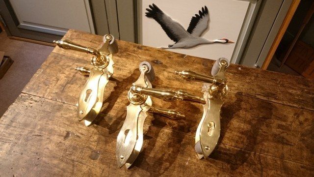 Drückergarnitur nach altem Darßer Vorbild, mit breitem Schildern und Drückern ohne Spitze.