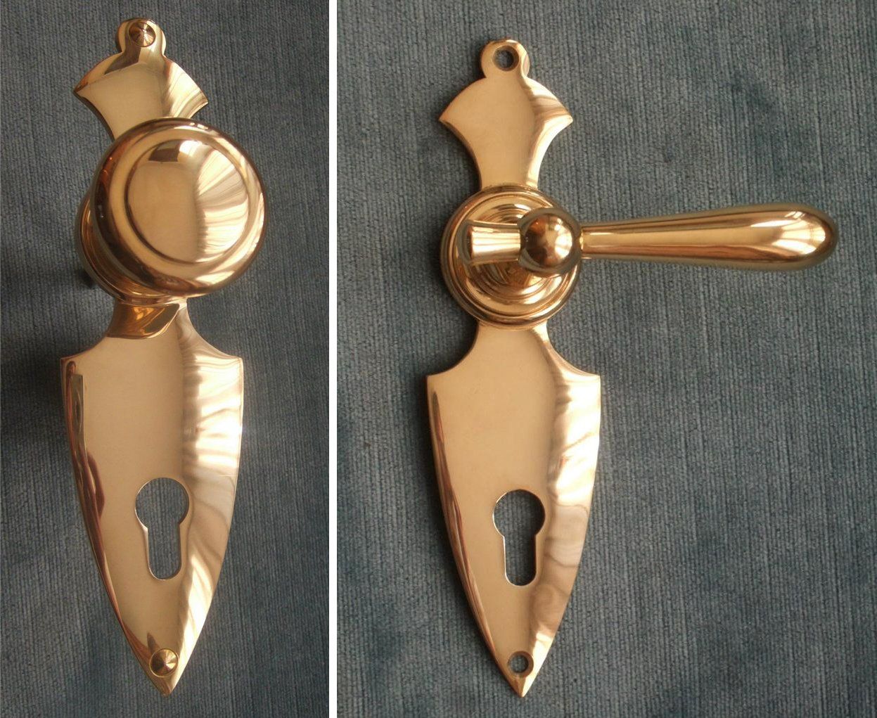 Die Beschläge sind so gestaltet, dass sie von außen nicht abschraubbar sind. Sie sind aus Messing gefertigt und haben keine Oberflächenbehandlung. Dadurch bekommen die Beschläge mit der Zeit eine schöne, natürliche Patina, können aber auch mit wenig aufwand schnell wieder aufpoliert werden.