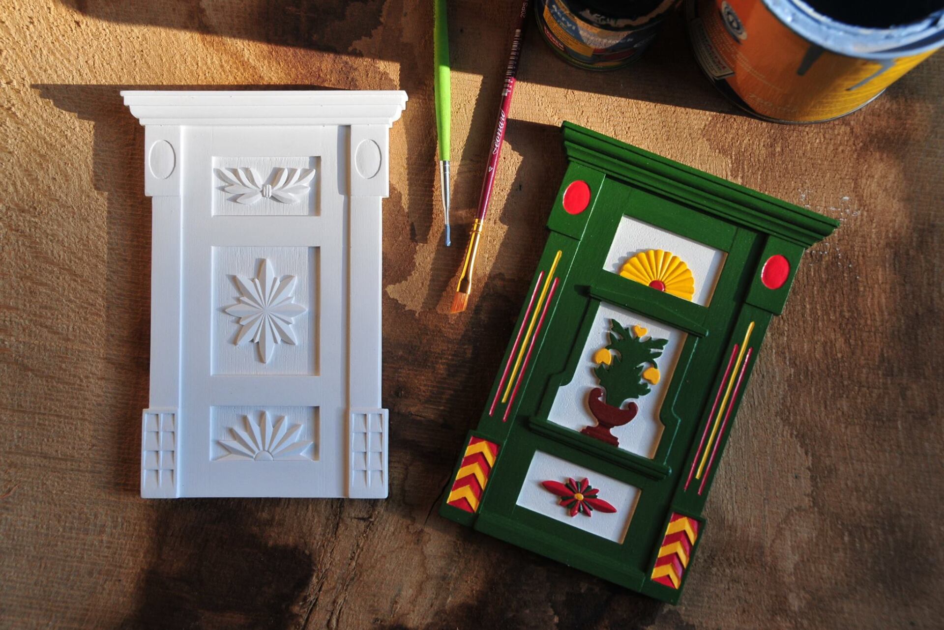 Das Modell mit dem großen Tulpenstrauß ist die detailgetreue kleine Version der Originaltür des Gemeindeamtes von Prerow.